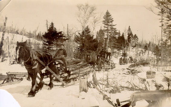 Horses hauling logs to the paper mill at Grand Falls, circa 1920.