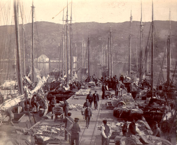 A busy day at the Job Brothers Premises on the north side of the harbour at St. Johns, 1907.