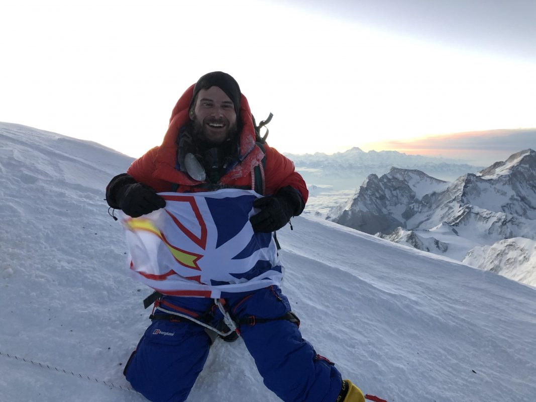 An elated Mark Ballard with his Newfoundland and Labrador flag on the world's highest peak.