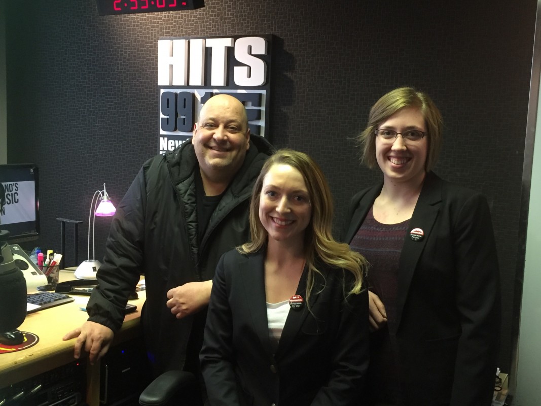 From left, Hits FM host Randy Snow; Kyia Hynes, Class of 2018; and Sydney Saunders, Class of 2017, smile for the camera following an interview the pharmacy students did to promote Pharmacist Awareness Month 2016.