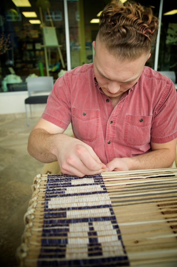Following along a pattern, Dennis Wass focuses intently on a loom as he threads blue and white beads onto strips of hide.