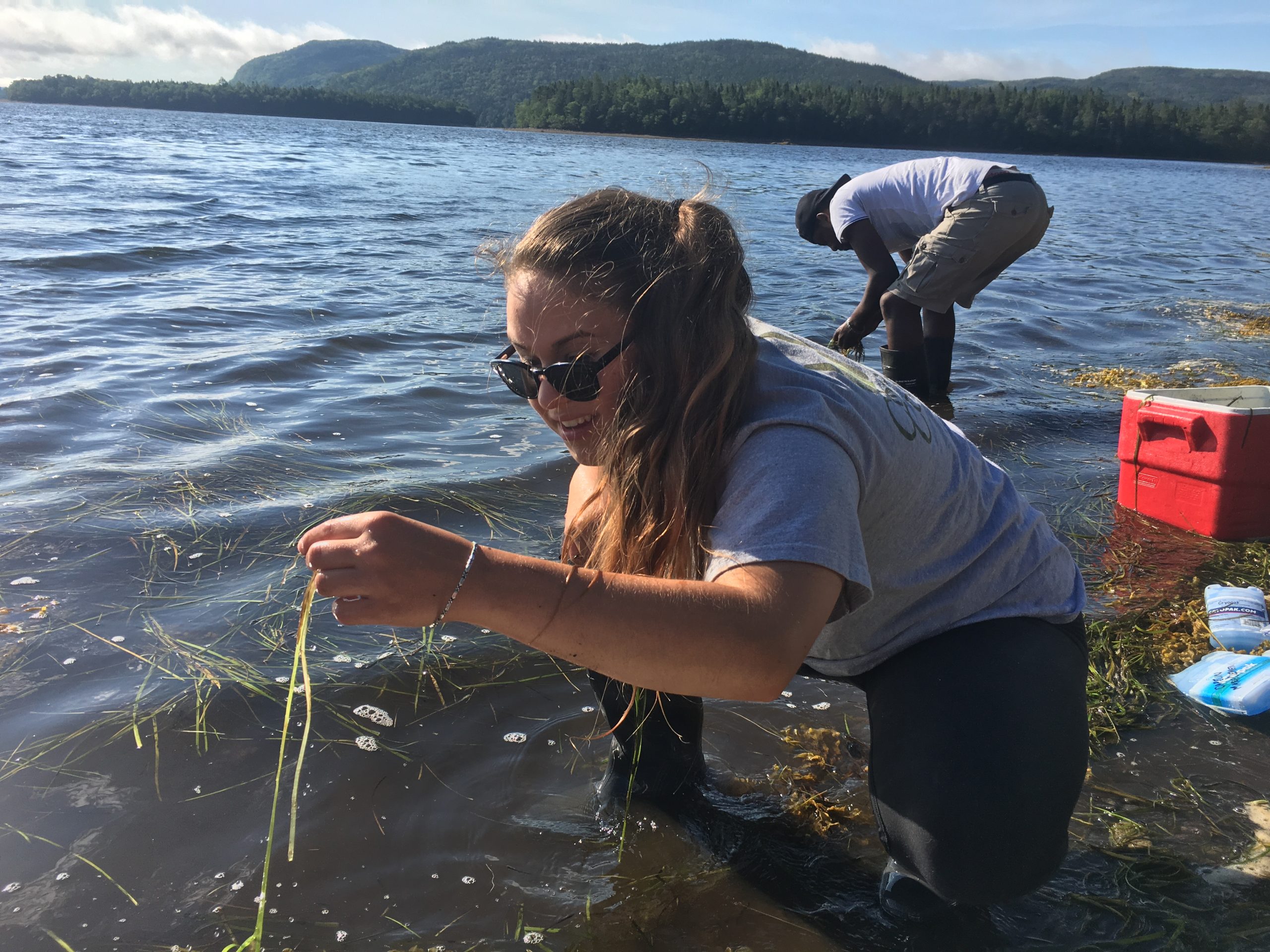 Work term student Machaela MacDonald collecting eelgrass seed shoots in Swift Current, N.L., for transplanting in Placentia Bay.