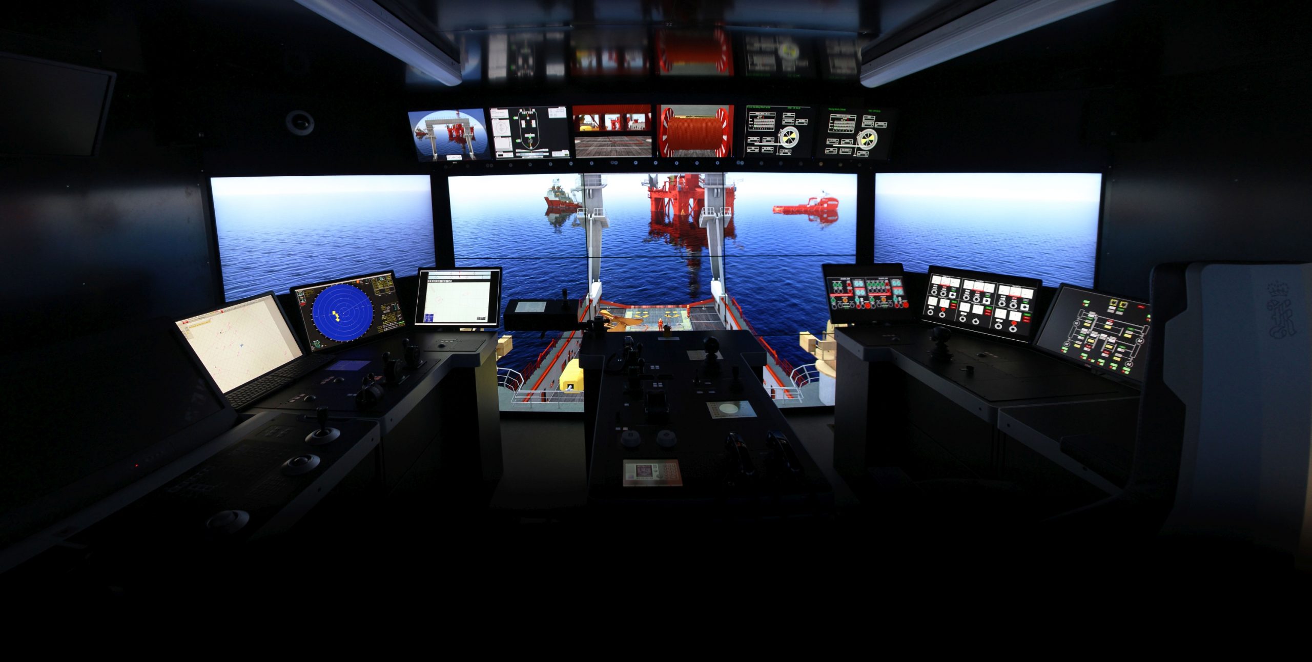 The Heritage Bridge Simulator, manufactured by Kongsberg, is a class A ship simulator configured to the bridge design of an offshore shuttle tanker, complete with a dynamic positioning system.