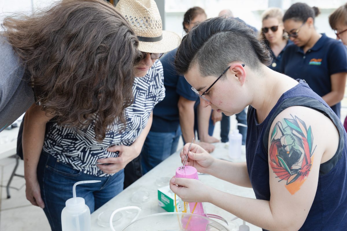 About 100 educators participated in the workshop. Here, Dr. Liboiron examines some of the plastics they found in the Hudson River.