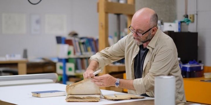 “The amount of books that come to me for repair or binding has dropped off. Now, my main focus is archival material,” he explained. “Usually anything new to the collection or anything that is in the collection that has become damaged through use and misuse comes to me.”