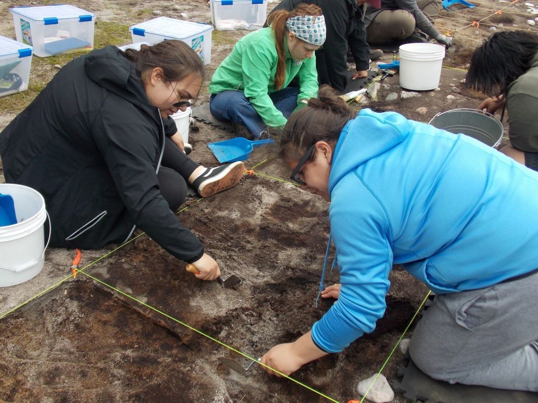 Kayla Jourdain Montague, right, works at archaeological dig site FjCa-51 in her community of Sheshatshiu, Labrador, with her fellow field school participants in the summer of 2017.